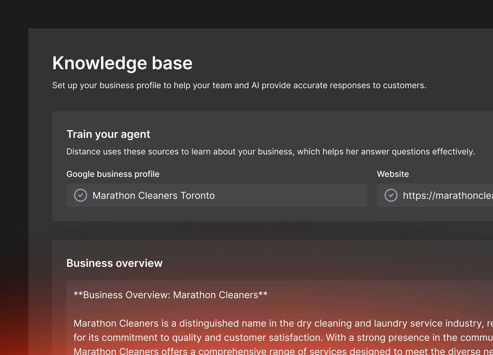 Add your services, pricing, and answers to common questions. Distance uses this to answer calls and messages the way you would.