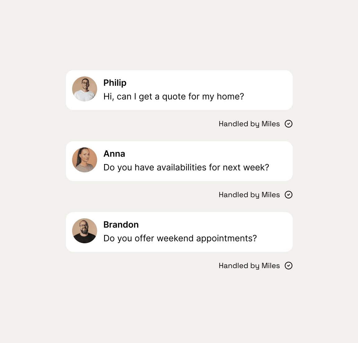 Enable Miles to manage inbound conversations automatically. Review summaries, identify qualified leads, and focus on prioritizing high-value opportunities.